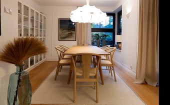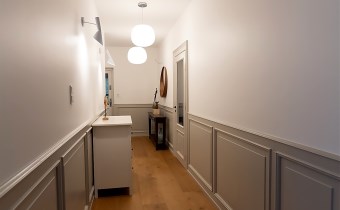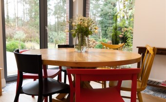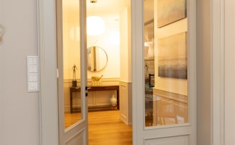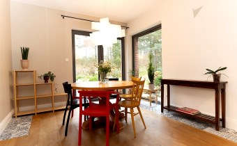 Do kolejnej części domu prowadzą nas z kuchni z jadalnią stylowe drewniane drzwi z dużym przeszkleniem za którymi znajdują się: