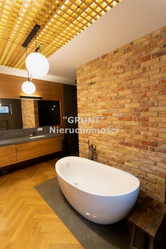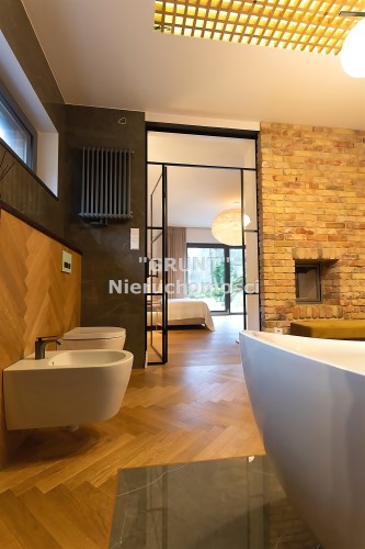 Wyjątkowa sypialnia z pokojem kąpielowym. Duża sypialnia z widokiem na ogród i wyjściem na taras na którym poranili z kawą są wyjątkowe. Pokój kąpielowy z gustowna wanna wolnostojącą i częścią z natryskiem. Pokój kąpielowy z dużymi lustrami, elementami drewna i stylowej cegły