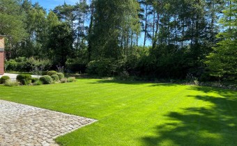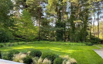 Ogród pełen wieloletnich nasadzeń zachwyca o każdej porze roku – to wymarzone miejsce na poranną kawę, letnie obiady, zabawy z dziećmi czy wieczorne spotkania przy zewnętrznym kominku.