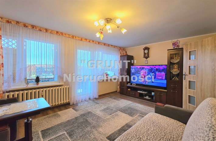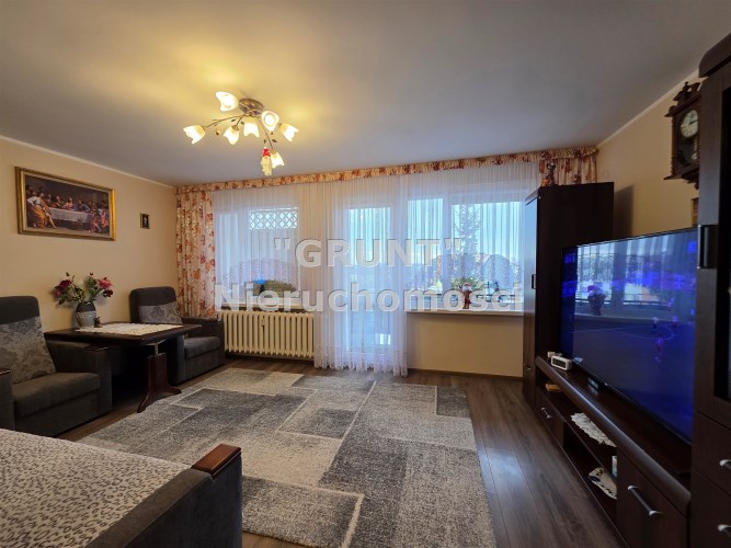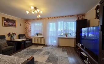 Przestronny salon od strony południowo wschodniej z wyjściem na duża balkon. na podłodze panele , ściany malowane.
