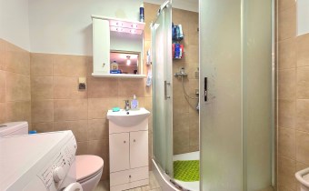 łazienka z kabiną natryskową ; kafelki na podłodze i na ścianach.