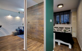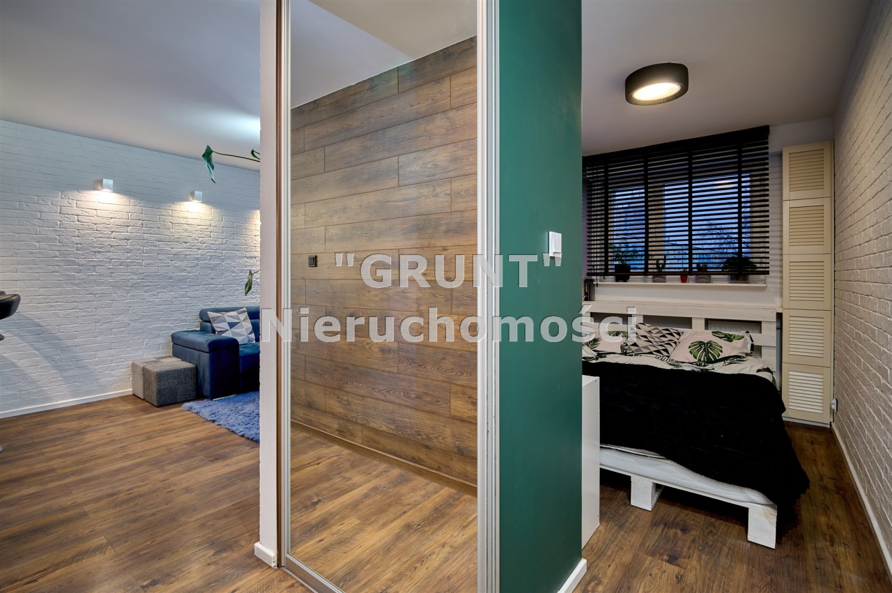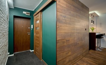 W przedpokoju pojemna szafa w zabudowie. Ciekawym i designerskim rozwiązaniem są przesuwne drzwi do sypialni z lustrem, identyczne jak front szafy. Lustro optycznie powiększa przestrzeń, a jednocześnie dyskretnie ukrywa wejście do sypialni, nadając wnętrzu nowoczesny charakter.