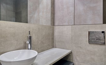 Łazienka została wykończona w surowym, nowoczesnym stylu inspirowanym betonem architektonicznym. Znajdziesz tu prysznic typu walk-in z odpływem liniowym oraz WC na stelażu typu Geberit. Minimalizm, estetyka i funkcjonalność w jednym.
