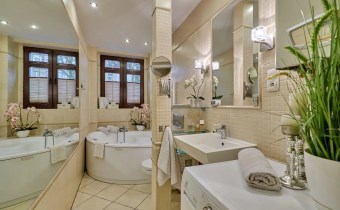 - dwa kominki obłożone trawertynem, które służą jako źródło ogrzewania oraz klimatu w mieszkaniu,