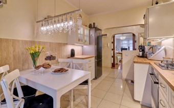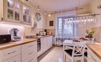 - Kuchnia o pow. 13,2m2 z wyjściem na balkon: centralnym punktem mieszkania jest przestronna, nowoczesna kuchnia w stylu prowansalskim, która jest w pełni wyposażona. Z balkonu widok na ogród różany. Zabudowa i sprzęt AGD w cenie (płyta gazowa oraz piekarnik firmy Electrolux z funkcją pieczenia na parze, zmywarka Siemens),
